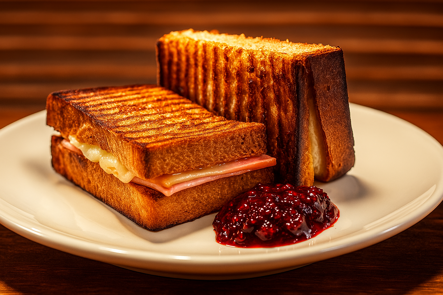 Tostado crocante, queso derretido y jamón calentito por dentro, acompañado con un toque de mermelada de frutos rojos. La mezcla justa de salado y dulce que no sabías que necesitabas.